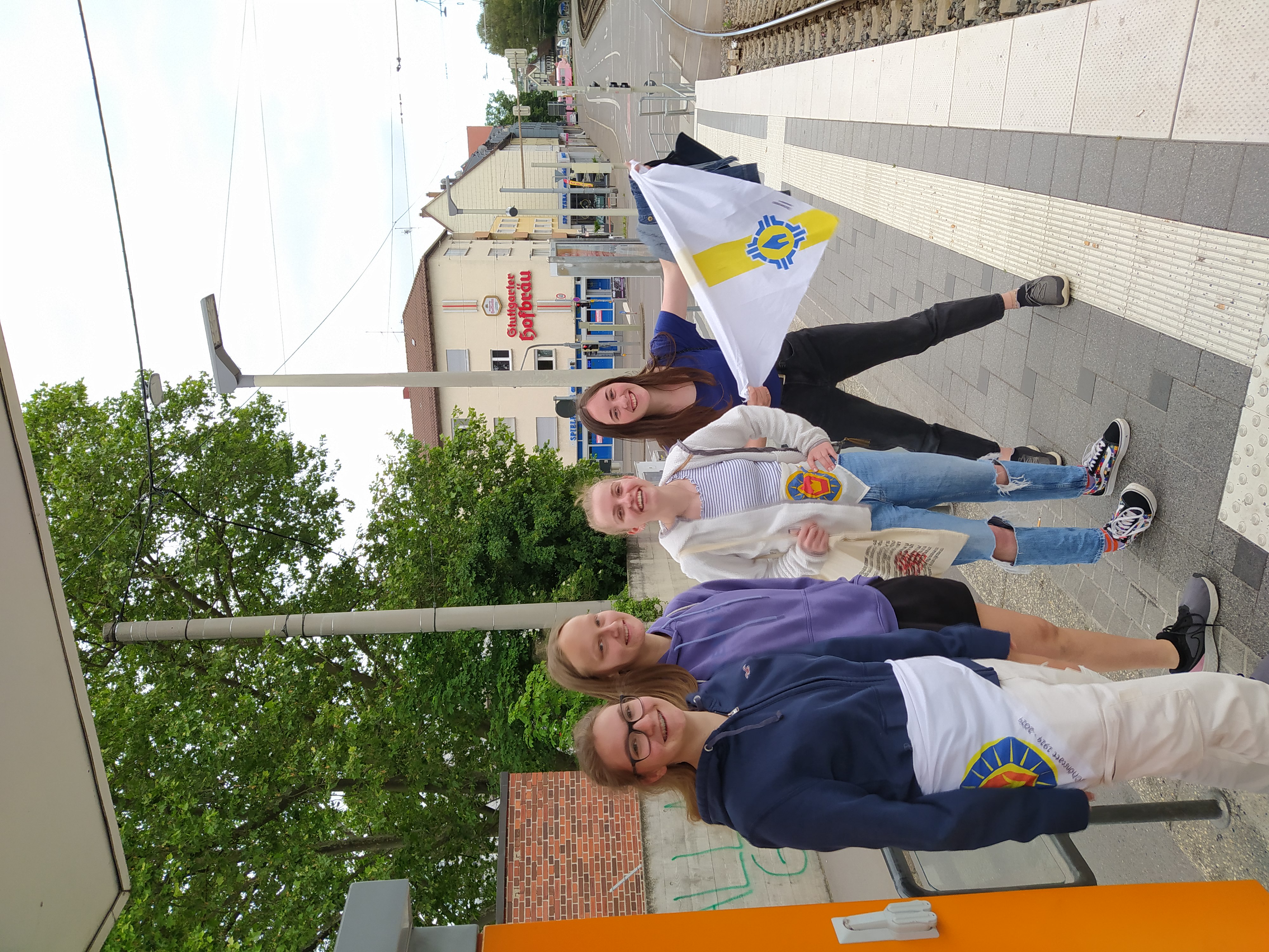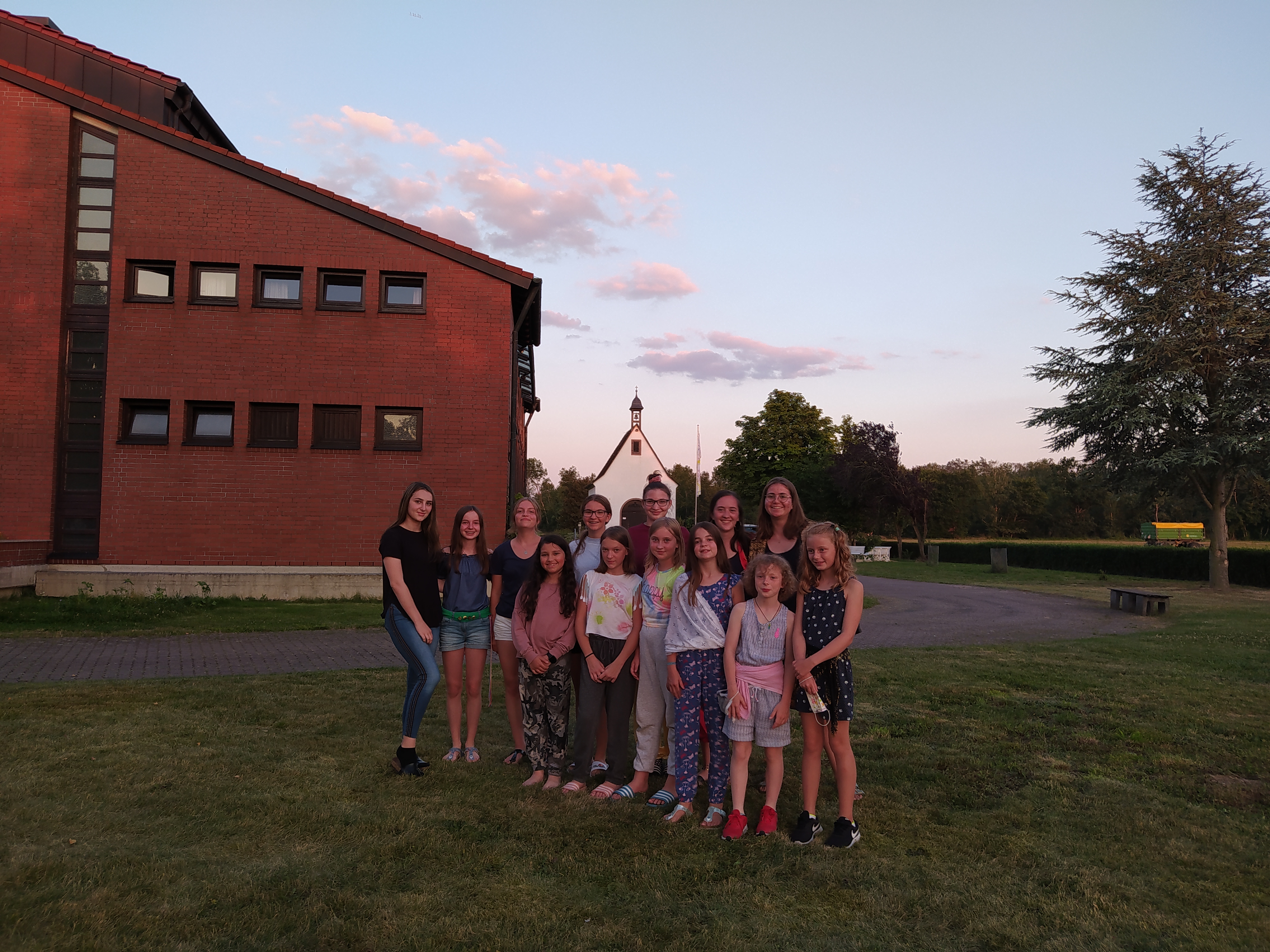 Nachdem wir uns getroffen, getestet, das Gepäck verladen und die Snacks für unterwegs verteilt hatten, haben wir eine kleine Aussendung gefeiert. Zu Beginn der Reise war es uns wichtig, dass jede sich überlegt: Was habe ich eigentlich dabei? Was trage ich mit mir? Was beschäftigt mich? Mit Gesang und Gebet sind wir in unseren ersten Streckenabschnitt gestartet. Das große Ziel: Kennenlernen. Rausfinden, mit wem man die nächsten Tage, die nächsten Kilometer, die nächsten Herausforderungen so verbringt. Wir waren eine bunte Truppe von elf Mädels zwischen elf und neunzehn Jahren. Nach vielen aufschlussreichen Gesprächen, haben wir bereits den ersten Zwischenstopp gemacht. Auf einem Spielplatz konnten wir uns mit der Frage beschäftigen, weshalb wir überhaupt pilgern gehen. Man muss ja zugeben - es ist mitnichten etwas alltägliches. Liedersingen und gute Stimmung haben ab der ersten Station nie gefehlt. Dazu beigetragen hat auch das warme Wetter des ersten Tages, das unseren Wasservorräten eher weniger gut getan hat. Glücklicherweise hat die Familie einer Teilnehmerin uns einen Zwischenstopp zum Flaschen füllen bei sich ermöglicht, sodass wir gut gestärkt weiterziehen konnten, zu unserer zweiten Station. Hier haben wir uns mit unserer eigenen Persönlichkeit und unseren Motivationen für unser individuelles Leben auseinandergesetzt. Mit der Versicherung Gottes aus Psalm 139,13 , dass jede von uns genauso so, wie sie ist, gewollt ist, konnten wir ja nur voller Tatendrang weiterziehen. Da wir am Pfingstwochenende unterwegs waren, haben wir uns an unserer dritten Station nocheinmal mit der gesamten Osterzeit auseinandergesetzt. Zu den einzelnen Tagen, von Aschermittwoch bis Pfingstmontag, haben wir uns in Kleingruppen, während der nächsten Kilometer, über passende Impulsfragen ausgetauscht. Platt aber glücklich kamen wir abends im Pfarrheim von Neu-Isenburg an, unserem ersten Schlafplatz. Nach einer ordentlichen Portion Taco-Salat, war die Energie bei einigen noch so groß, dass laut gelacht, getanzt, gesungen und gespielt wurde, den großen Blasen an den Füßen einiger trotzend. Unser lieber Gepäcktransporter hatte unsere Schlafsäcke und Isomatten ebenfalls in Neu-Isenburg abgeliefert, sodass wir, nach einer einigermaßen bequemen Nacht, in unseren zweiten Streckenabschnitt starten konnten.