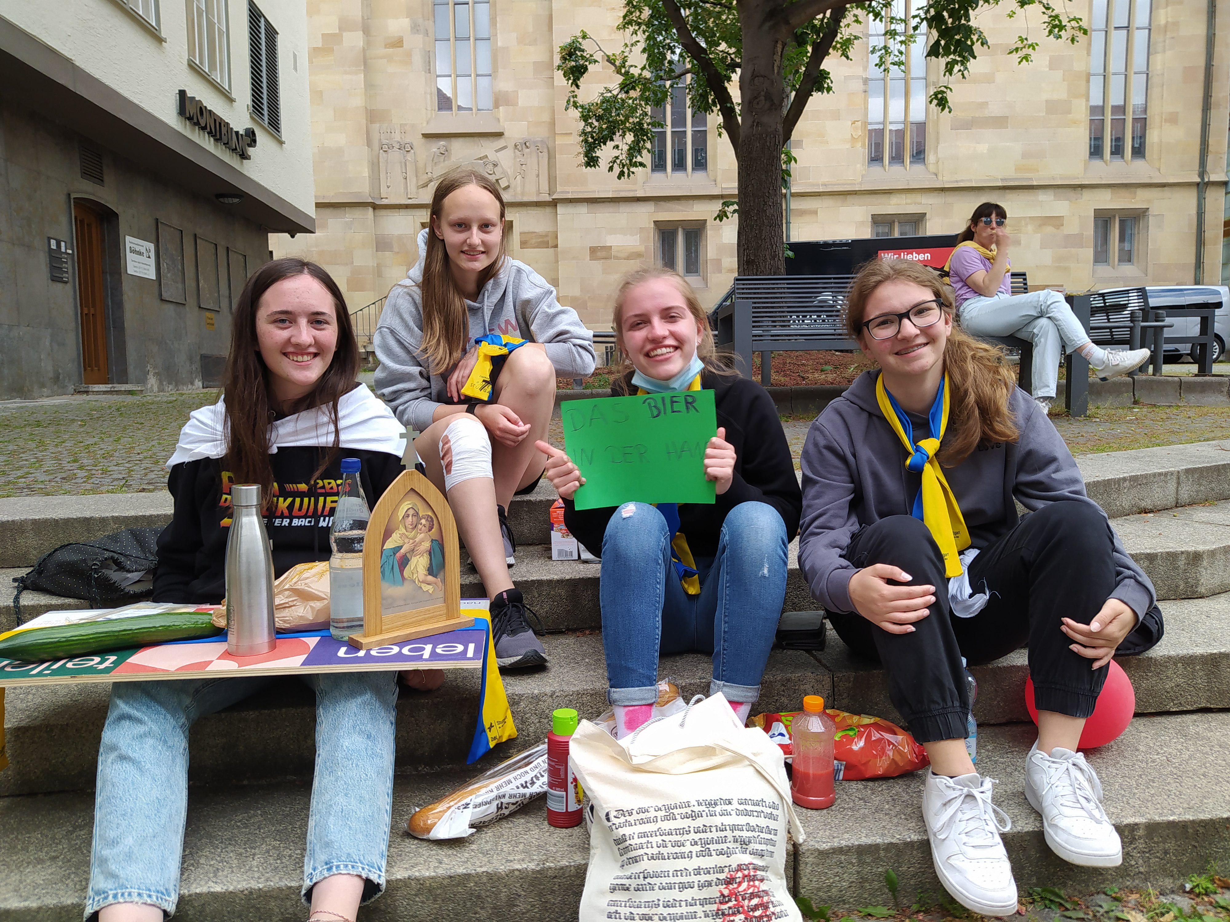 Dieses Jahr haben sich fünf Mädchen von der MjF-Mainz auf zum Katholikentag gemacht. Nach der Anreise in Stuttgart haben wir erstmal unsere Zelte bezogen - wir haben uns nämlich kurzer Hand bei den Pfadfindern einquartiert! Danach gab es für uns noch Abendessen und einen entspannten Abend am Lagerfeuer.